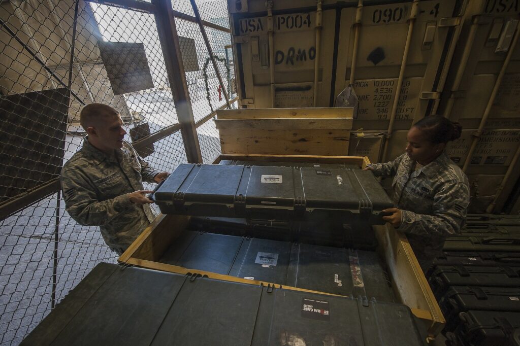 U.S. Air Force Staff Sgt. Jeremy Chandler, left, a weapons manager with the 376th Expeditionary Logistics Readiness Squadron (ELRS), and Senior Airman Marita McCoy, an inbound specialist with the 376th ELRS, pack weapons cases into a crate for shipping at Transit Center at Manas, Kyrgyzstan, Dec. 10, 2013. (U.S. Air Force photo by Senior Airman George Goslin/Released)