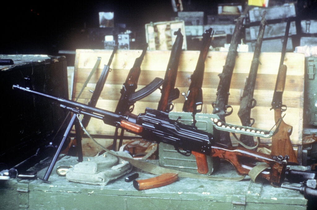 A Soviet-made 7.62mm PKM light machine gun and other weapons seized during Operation Urgent Fury.