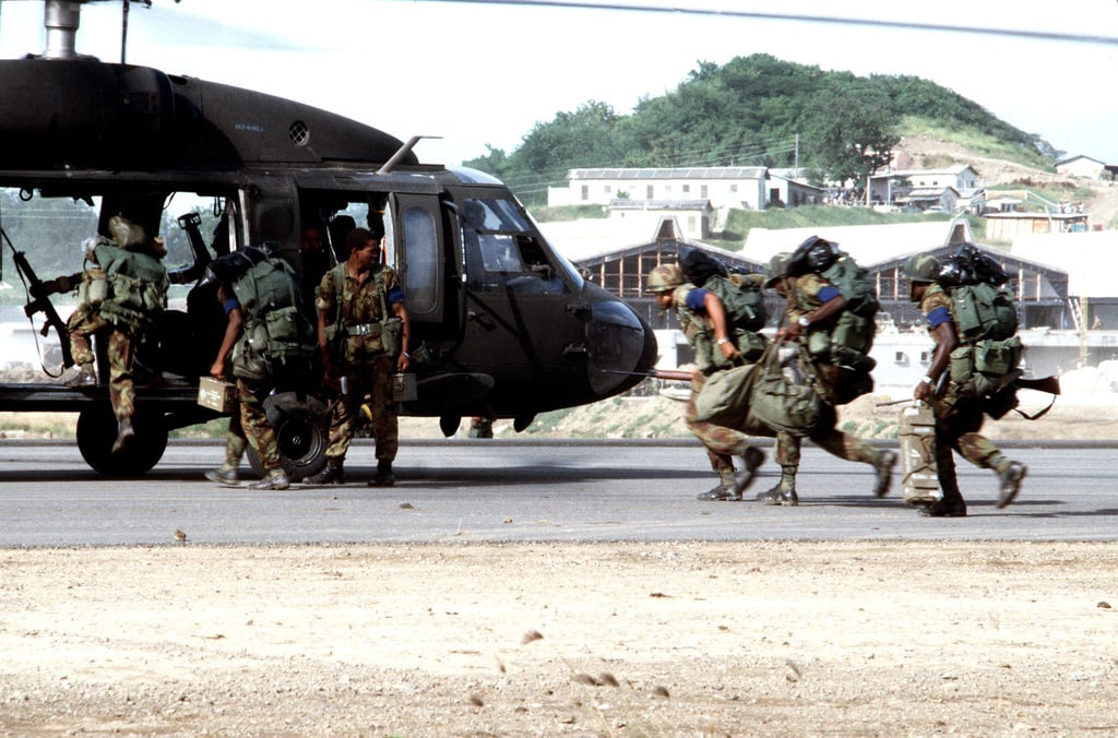 Members of the Eastern Caribbean Defense Force board a UH-60 Black Hawk helicopter during Operation Urgent Fury, on October 25, 1983.
