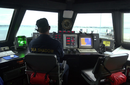 Sea Shadow (IX-529) Wheelhouse (United States Navy). Darrell Griffin, the Lockheed Martin contract manger of Sea Shadow operations for Naval Sea Systems Command, watches a submarine pull into San Diego Bay.